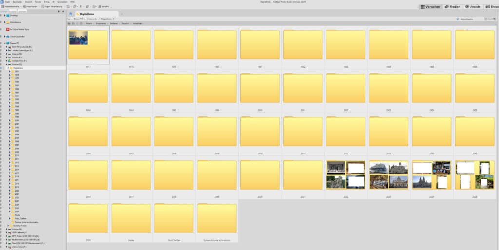 Nachdem die JPEG-Dateien in die entsprechenden Verzeichnisse eingestellt wurden, werden in einem nächsten Schritt die Bilddateien in der Software ACDSee Photo Studio bearbeitet. Diese Software verwende ich seit vielen Jahren zur Organisation meiner Bilddateien. Die  Software bietet eine Vielzahl von Funktionen zur Bearbeitung von Bildinformationen, zur Bearbeitung von Bilddateien und neuerdings auch KI-gestützte Funktionen, etwa zur Gesichtserkennung. Ich verwende ACDSee hauptsächlich für die Organisation der Bilder, die Pflege der Bildinformationen und Stapel-Verarbeitungsfunktionen, etwa um Datum und Uhrzeit von Bildern zu ändern, falls ich das Umstellen des Aufnahmedatums in der Kamera selbst vergessen habe.