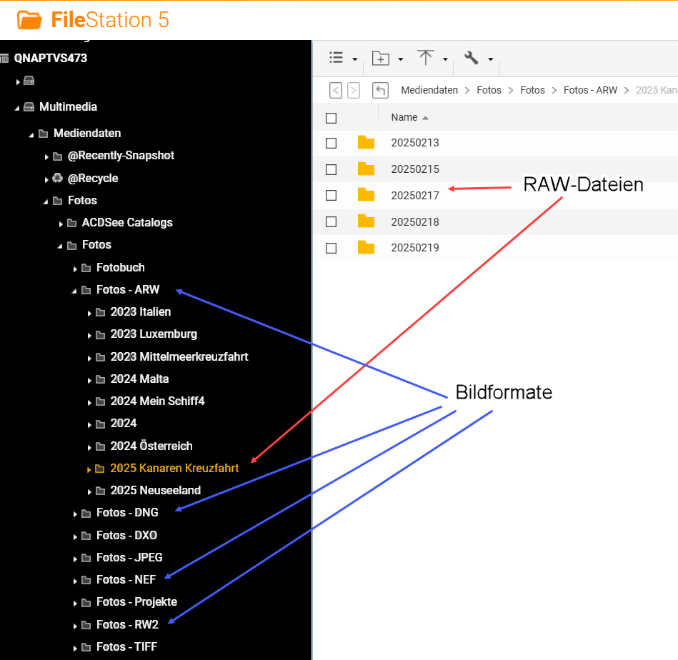 • Fotos – ARW: RAW-Bilddateien von Sony-Kameras. Hier liegen auch die RAW-Dateien von der Kanarenkreuzfahrt 2025.